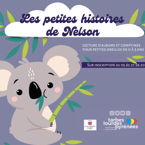 Tarbes - Les petites histoires de Nelson Tarbes - Les petites histoires de Nelson Prochaine session Le mercredi 12 novembre 2025 de 10:30 à 11:00 Ajouter à mon agenda Public Tout-petits Secteur Tarbes-Lourdes-Pyrénées Lieu TARBES NELSON MANDELA Voir le détail de l'événement